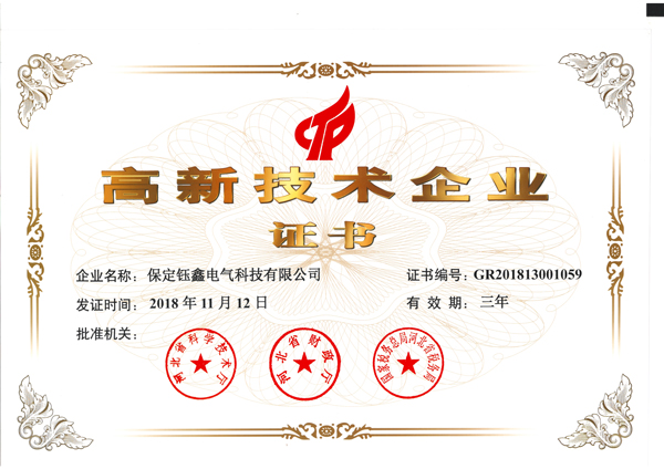 高新技術(shù)企業(yè)證書    企業(yè)名稱:保定鈺鑫電氣科技有限公司      證書編號:GR201813001059