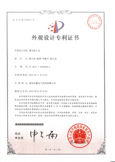 外觀設計名稱:蓄電池上蓋,專利號:ZL 2013 3 0546446.0,專利申請日:2013年11月14日,專利權人:保定鈺鑫電氣科技有限公司