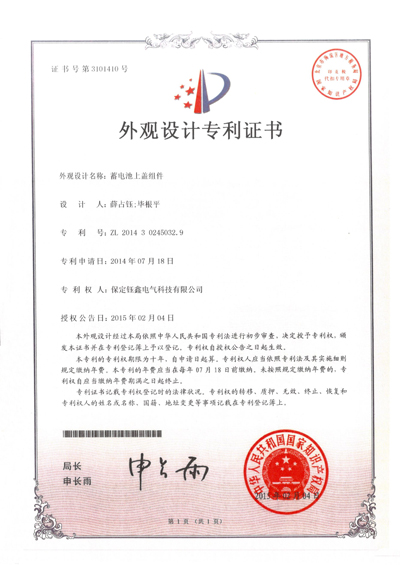 蓄電池上蓋組件外觀設(shè)計專利證書