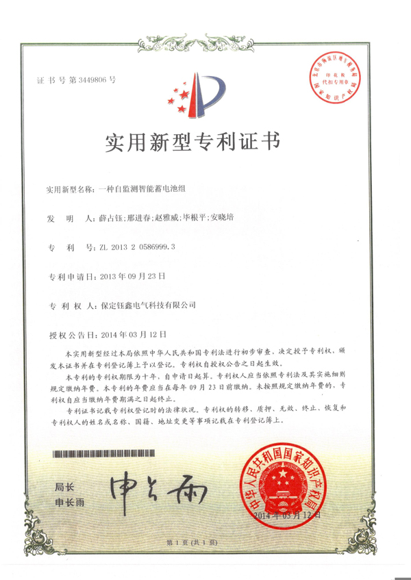 一種自監(jiān)測智能蓄電池組實用新型專利證書