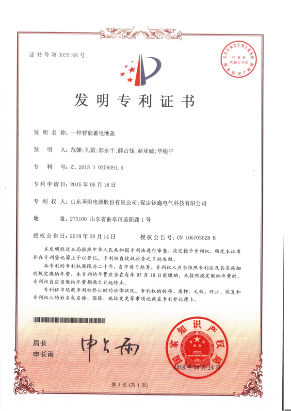 發(fā)明名稱:一種智能蓄電池蓋,專利號:ZL 2015 1 0259091.5,專利申請日:2015年05月18日,專利權(quán)人:山東圣陽電源股份有限公司;保定鈺鑫電氣科技有限公司,授權(quán)公告日:2018年08月14日