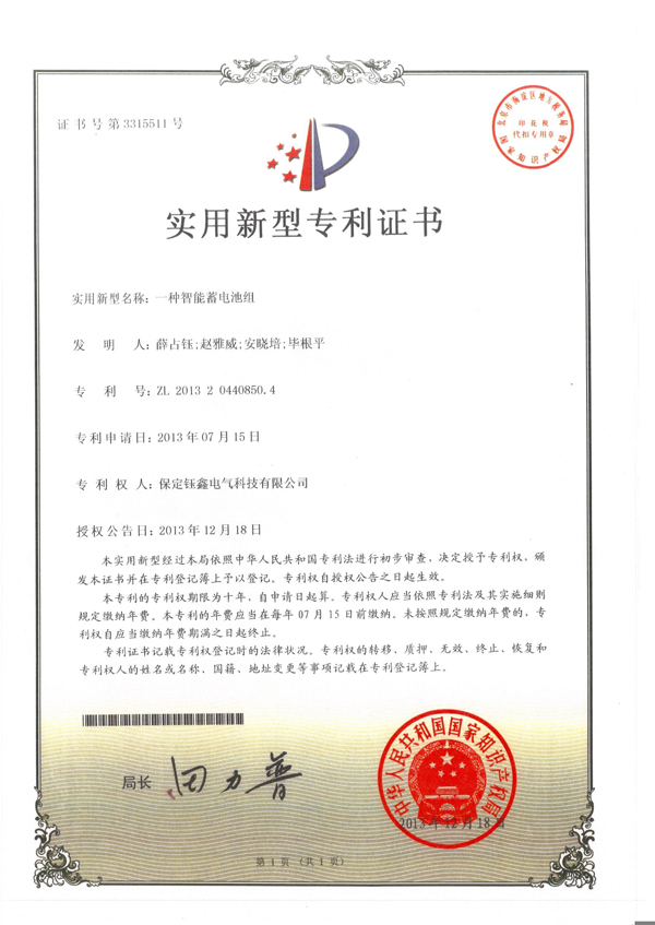 實(shí)用新型名稱:一種智能蓄電池組,專利號:ZL 2013 2 0440850.4,專利申請日:2013年07月15日,專利權(quán)人:保定鈺鑫電氣科技有限公司,授權(quán)公告日:2013年12月18日