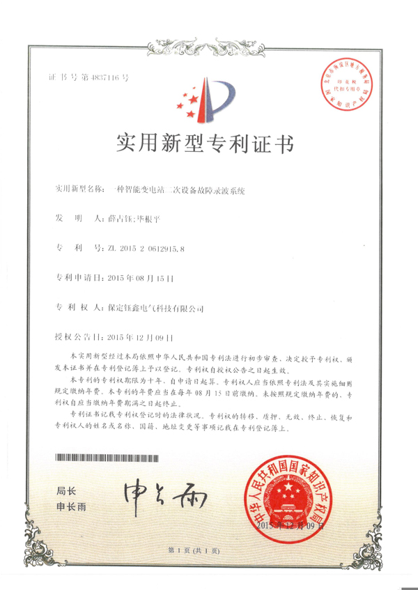 實(shí)用新型名稱:一種智能變電站二次設(shè)備故障錄波系統(tǒng),專利號:ZL 2015 2 0612915.8,專利申請日:2015年08月15日,專利權(quán)人:保定鈺鑫電氣科技有限公司,授權(quán)公告日:2015年12月09日
