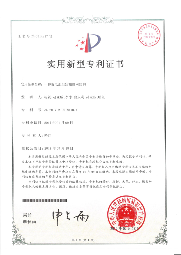 一種蓄電池組監(jiān)測(cè)組網(wǎng)結(jié)構(gòu)實(shí)用新型專利證書