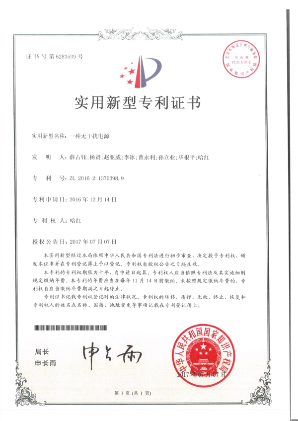 實用新型名稱:一種無干擾電源,專利號:ZL 2016 2 1370398.9,專利申請日:2016年12月14日,專利權(quán)人:哈紅,授權(quán)公告日:2016年07月07