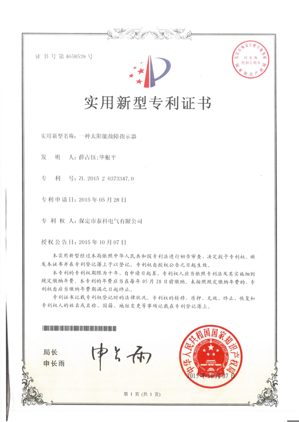 一種太陽(yáng)能故障指示器實(shí)用新型專(zhuān)利證書(shū)
