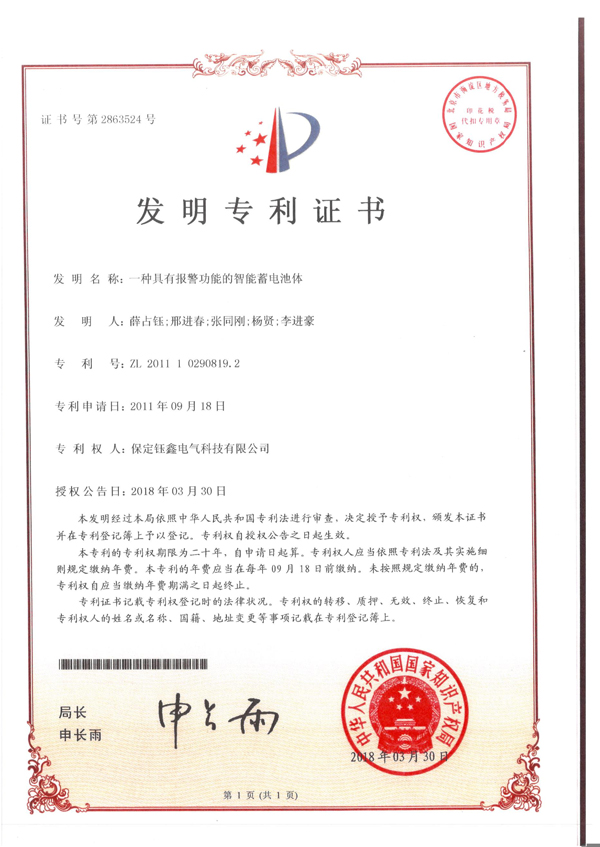 一種具有報(bào)警功能的智能蓄電池體發(fā)明專利證書