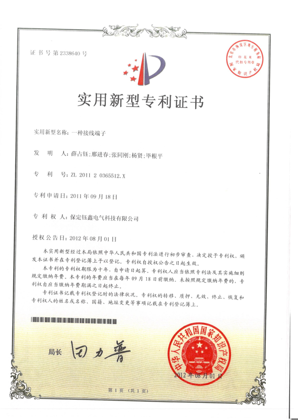 一種接線端子實(shí)用新型專(zhuān)利證書(shū)
