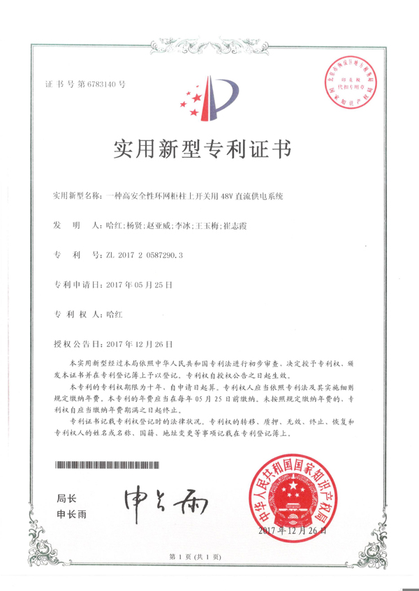 一種高安全性環(huán)網柜柱上開關用48V直流供電系統(tǒng)實用新型專利證書