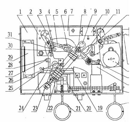 The 1 floor 2 auxiliary switch 3 crank arm 4 5 6 7 drive shaft screw spindle support plate 8 energy storage crutch 9 energy storage shaft 10 stroke switch 11 ratchet 12 cam 13 energy storage handle 14 energy storage motor 15 positioning pieces 16 closing release 17 terminal 18 manual closing ring 19 interlocking device 20 tripping tripping 21 manual switching ring 22 closing spring 23 bent plate 24 release 25 adjusting screws 26 half shaft adjusting screw adjustment screw 27 28 29 30 31 roller rocker arm load controller