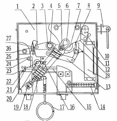 The 1 floor 2.. 3 screw spindle drive shaft 4 5 energy storage crutch 6 energy storage shaft 7 cam ratchet wheel energy storage handle 8 9 10 11 12 crank arm support plate to maintain a 13 win 14 terminal 15 tripping shaft 16 push rod 17 manual closing ring 18 closing spring 19 overcurrent release 20 axle 21 support plate 22 plate bending 23 adjusting screws 24 adjusting screws 25 arm 26 roller 27 composite controller