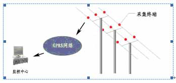 該裝置掛裝于線路上,收集故障信號(hào),并以GPRS(或短信)形式發(fā)送到監(jiān)控中心。
